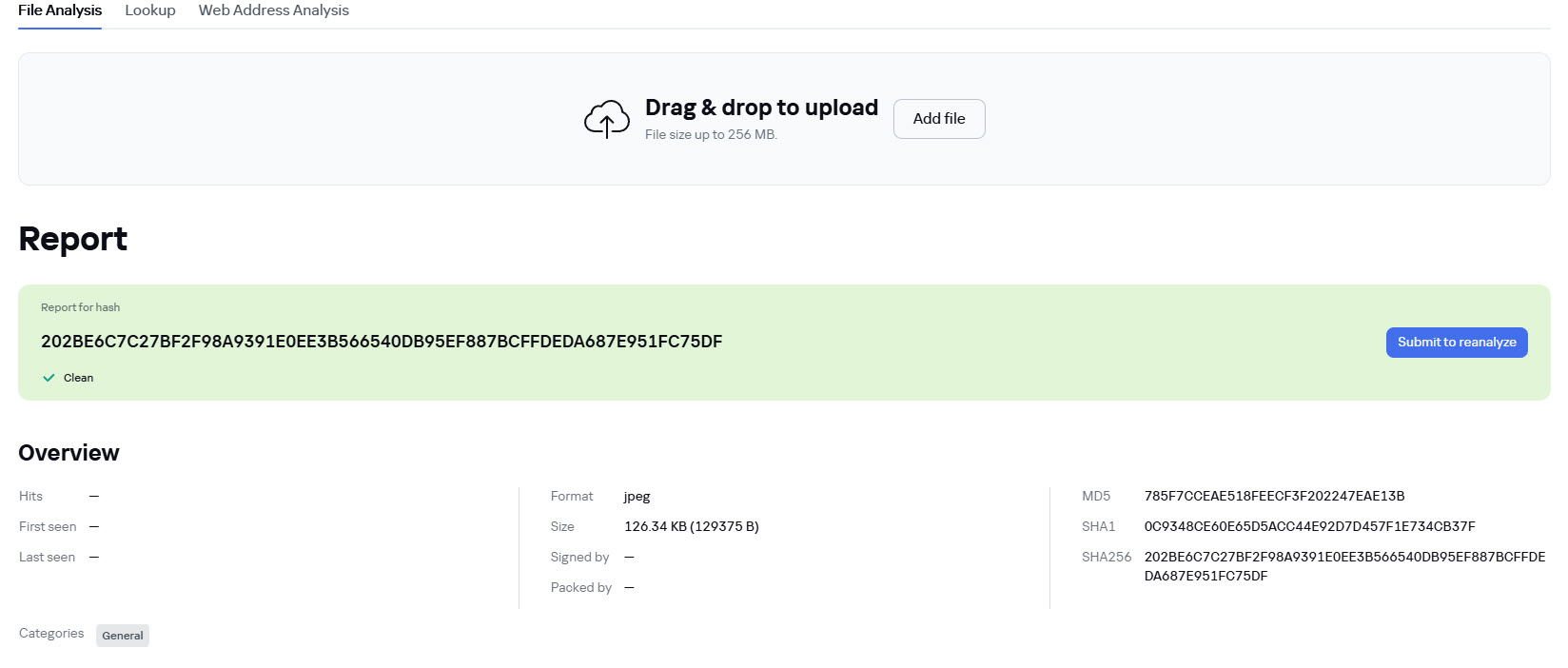 Во вкладке «Файл» можно проверить конкретный файл с компьютера. Сканирование осуществляет быстро. При этом результат достаточно подробный. Максимальный размер файла составляет 650 Мб.